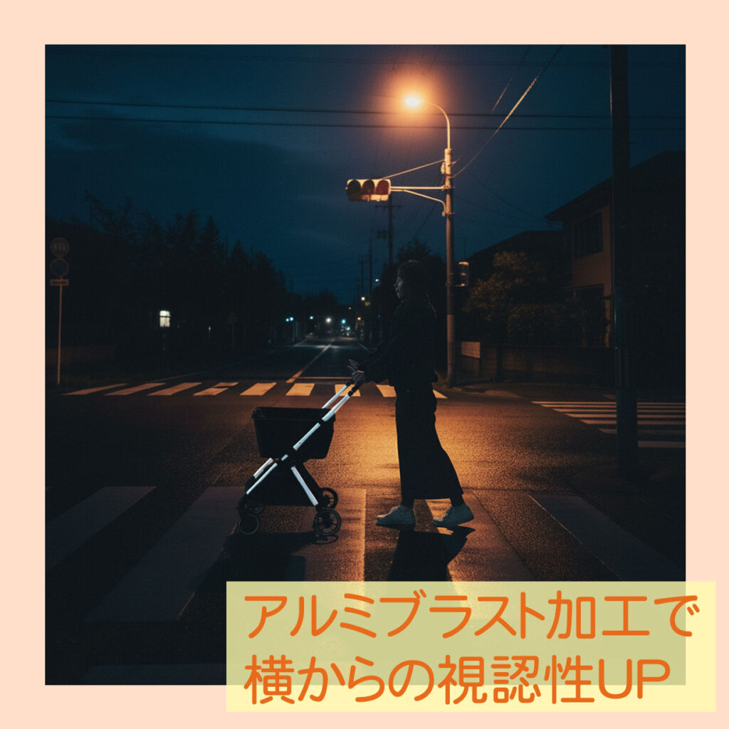 街灯の光を柔らかく反射し、夜間走行時の存在感を高めます。